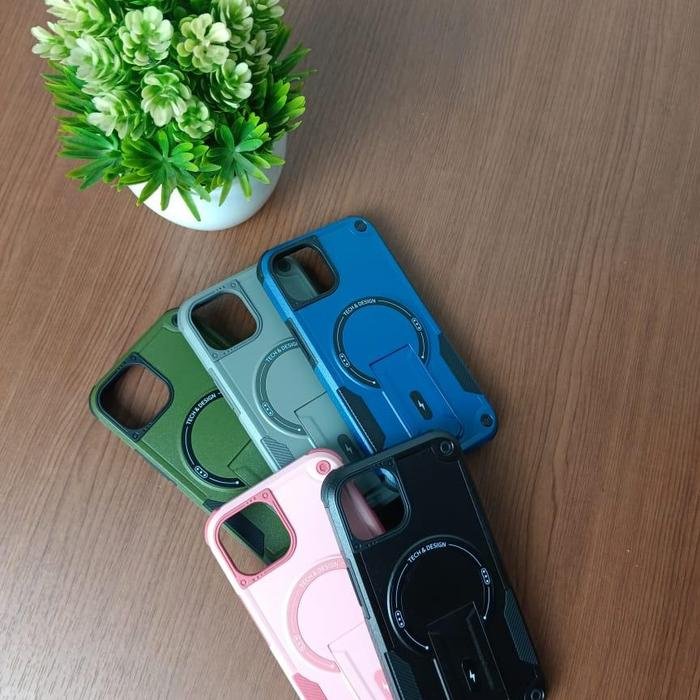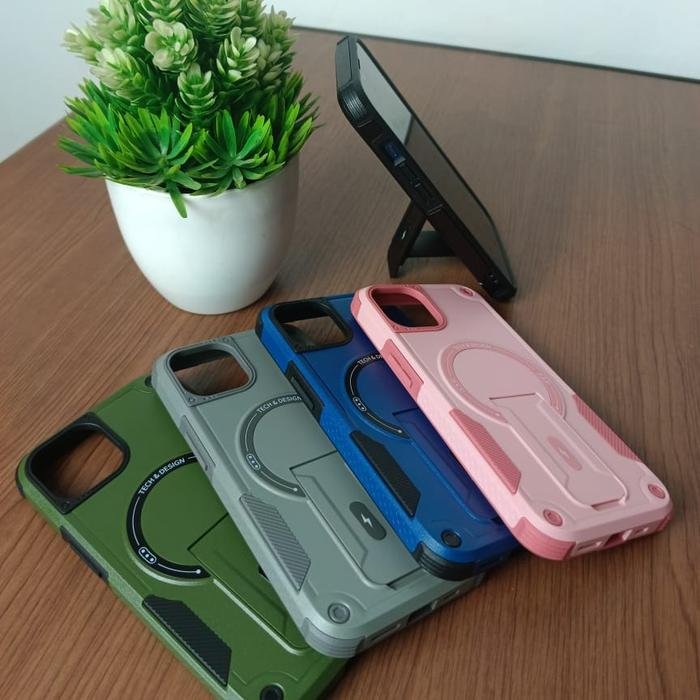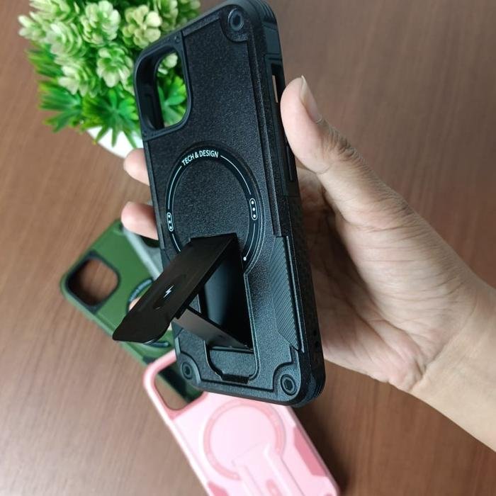 Bahan terbuat dari PC hard case, lalu support wireless charging. Case yang juga multifungsional karena terdapat braket untuk dijadikan stand handphone