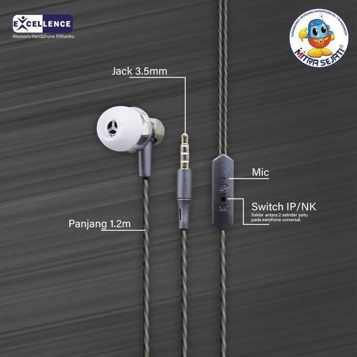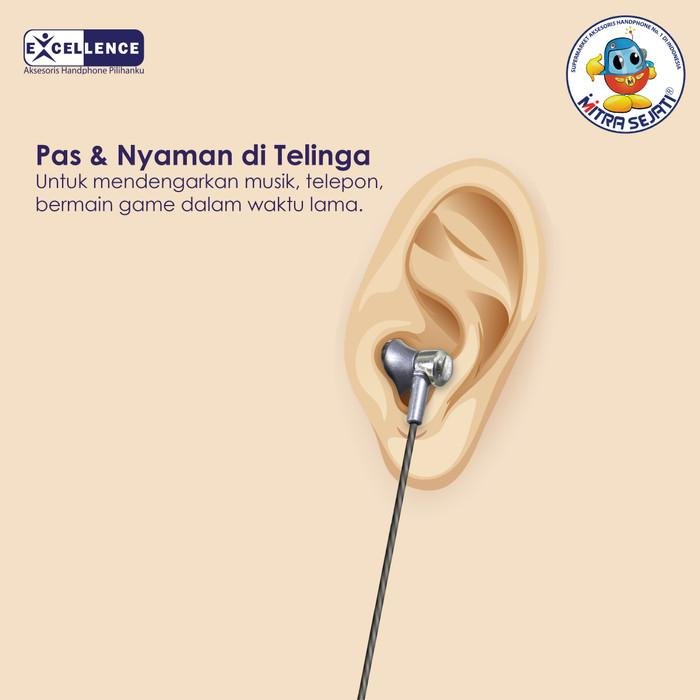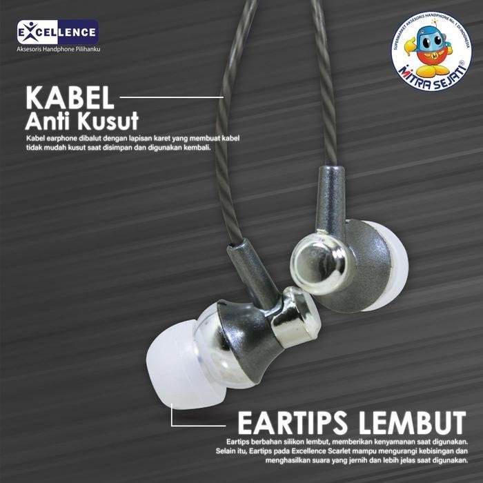 Handsfree Excellence Scarlet, merupakan handsfree yang dilengkapi dengan silikon lembut yang membantu pengurangan kebisingan. Headset dengan suara yang lebih jernih dan dilengkapi fitur megabass. headset ini dibuat dengan material yang aman sehingga awet dalam penggunaan dengan waktu yang lama.