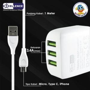 EXCELLENCE Travel Charger 3.4A Fast Charging 3USB Clint Micro USB/Lightning/Type-C